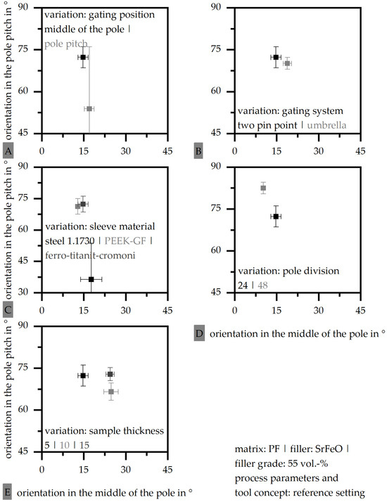 Figure 10 shows the change in the orientation in terms of the variation of the gating position (A), the gating system (B), the sleeve material (C), the pole division (D), and the sample thickness (E) in regards to a PF matrix material and a filler grade of 55 vol.-%. The process conditions and the tool concept are kept constant, despite the variations. Initially, the orientation was investigated in the middle of the sample thickness.