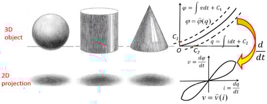 In other words, the φ-q plane is a space with “high-dimensionality” (if the charge–flux relationship of a memristor is a high-order polynomial as imagined by Chua [5]), whereas the v-i plane is its “dimensionality-reduced” space. Conformal differential transformation [4,5] projecting the φ-q curve onto the v-i plane just plays the role of dimensionality reduction (e.g., ). Imagine that we are shining a light from above a 3D object and looking at the shadow it casts on a 2D screen. The transformation from 3D to 2D is unique, but the opposite is not; we cannot work out whether the original 3D object is a ball, cylinder or cone when the 2D projection viewed is a circle. A schematic (Figure 1) best illustrates this. We cannot simply restore the lost information in the projection in a single “anti-projection”.