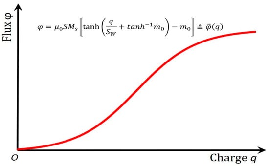 Figure 5 agrees with those experimentally observed φ-q curves in the magnetic cores [15,16,17]. Therefore, Equation (4) is used as a constitutive curve in this work. The constitutive curve in Figure 4 is dramatically different from that of Chua’s “fictitious” memristor with a charge–flux relationship in his tutorial [5]. We have for a hyperbolic function whose output range is normalized from −1 to 1 (no matter how big the input is), whereas we have for a polynomial function (that diverges to infinity). In other words, such a structure’s operation range is finite (where ), whereas the “fictitious” memristor’s range is infinite. Such a self-limiting hyperbolic tangent function is more natural than other functions since the S curve approaches 1 as x is +∞ and approaches zero as x is −∞. In biology and ecology, a self-limiting colony of organisms limits its own growth by its actions (releasing waste that is toxic to the colony once it exceeds a certain population) [18]. In this instance, there is a clear physical explanation for the saturation of this structure: it is because the magnetization vector is as aligned as the magnetic field allows it to be. The change in the magnetization alignment is negligible on increasing the field above this.