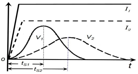 Induced voltage vs. a step-function input current. The higher the amplitude of the current I, the shorter the switching time ts.