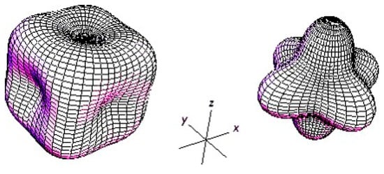 Cubic anisotropy energy surfaces. The magnetic moment in cobalt has a dependence of energy level towards one particular direction (the easy axis); then, it has uniaxial anisotropy. The biases in iron (left) and nickel (right) are toward many particular directions; then, they have multiple easy axes and possess cubic anisotropy [27].