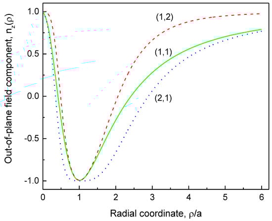 The profiles of the out-of-plane field component, , of the toroidal hopfions are shown in Figure 1 for the different hopfion vorticities . The profiles can be plotted by substituting the poloidal coordinate to Equation (1). The component = 1 and at the hopfion radius in the basal plane if the hopfion polarity .