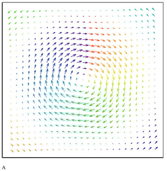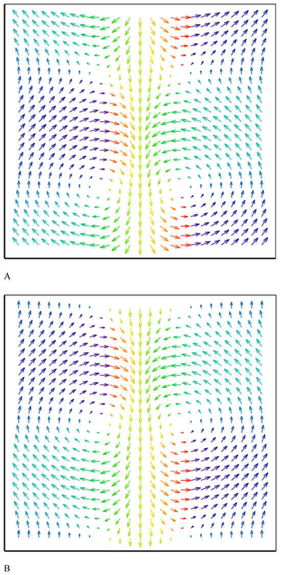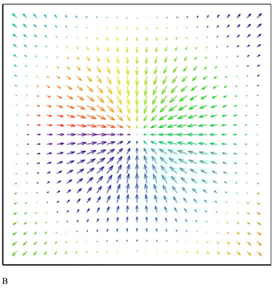 The in-plane magnetization components of the toroidal hopfions with the vorticities in the plane calculated by Equation (2): (A) the Bloch hopfion, ; (B) the Neel hopfion, .