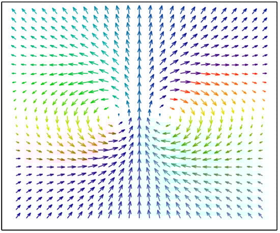 The in-plane magnetization configurations () of the toroidal Bloch and Neel hopfions plotted according to Equation (2) are shown in Figure 2. The spatial distribution of the magnetization components of the toroidal Bloch hopfion with the vorticities plotted in the plane is shown in Figure 3.