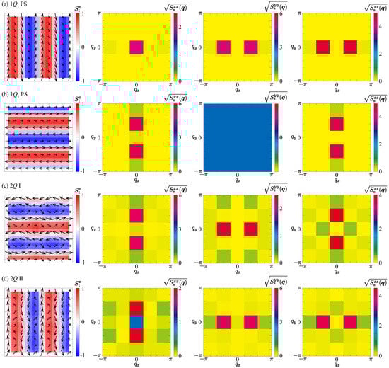 (Leftmost panels) The real-space spin configurations of (a) the 1 PS state at and , (b) the 1 PS state at and , (c) the 2Q I state at and , and (d) the II state at and . The arrows represent the direction of the in-plane spin moments, and the color shows its z component. (Right three panels) The square root of the spin structure factor for the x, y, and z spin components, respectively.