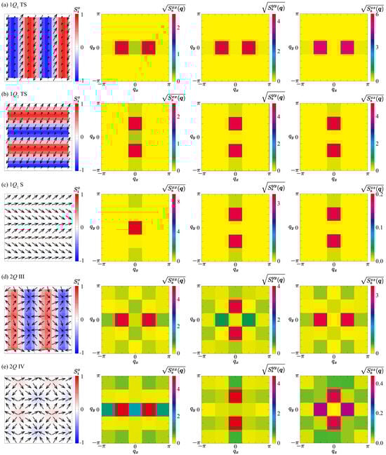 (Leftmost panels) The real-space spin configurations of (a) the 1 TS state at and , (b) the 1 TS state at and , (c) the 1 S state at and , (d) the III state at and , and (e) the IV state at and . The arrows represent the direction of the in-plane spin moments, and the color shows its z component. (Right three panels) The square root of the spin structure factor for the x, y, and z spin components, respectively.