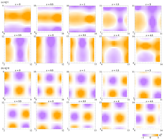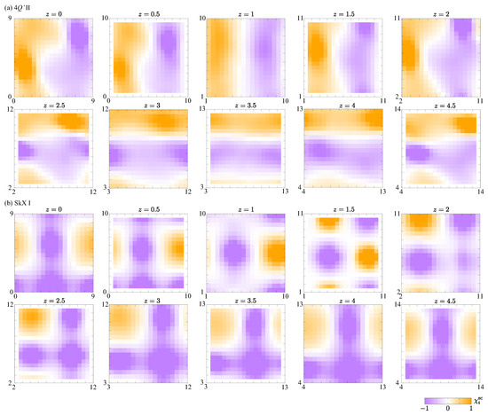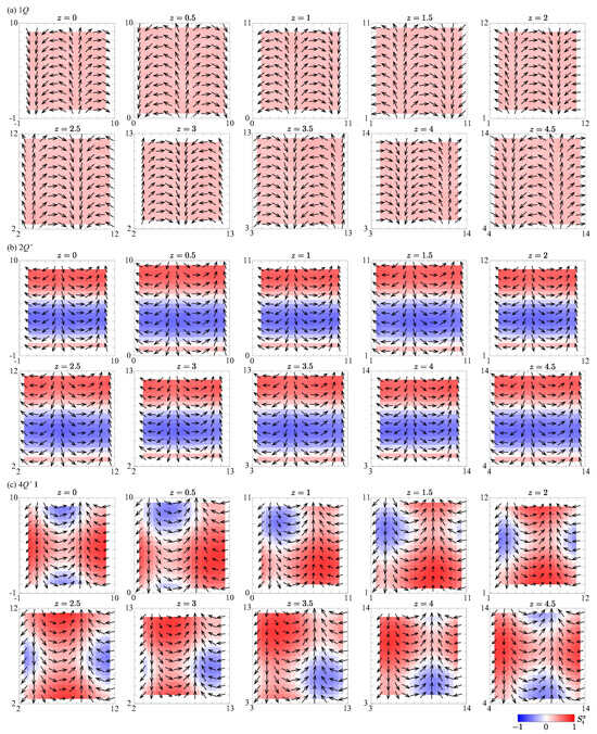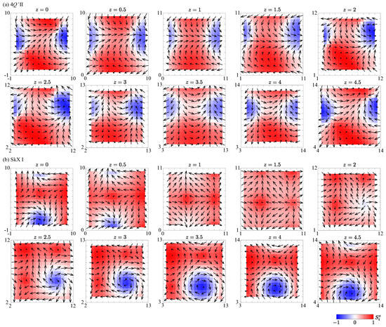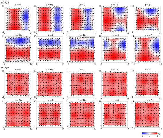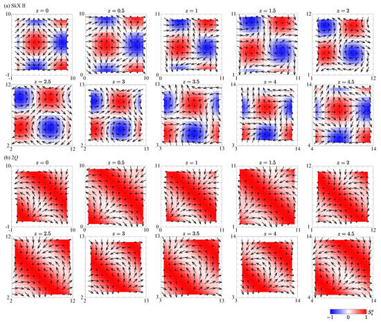 Meanwhile, in the high-field region, the system undergoes another significant transformation. The 1Q state is replaced by another quadruple-Q state denoted as the 4Q II state, as shown in Figure 1. As shown by the real-space spin configuration in Figure 4b, the z-spin oscillation almost vanishes, which indicates that the spin configuration is characterized by a superposition of quadruple-Q fan states with the -spin oscillations at –. The scalar spin chirality aligns in a checkerboard manner, which reflects the periodic alignment of the vortex and antivortex in terms of the -spin component, as shown in Figure 5b [94]. The phase transition between the 4Q I and 4Q II states is of first-order with the jump in the magnetization, as shown in Figure 3c.