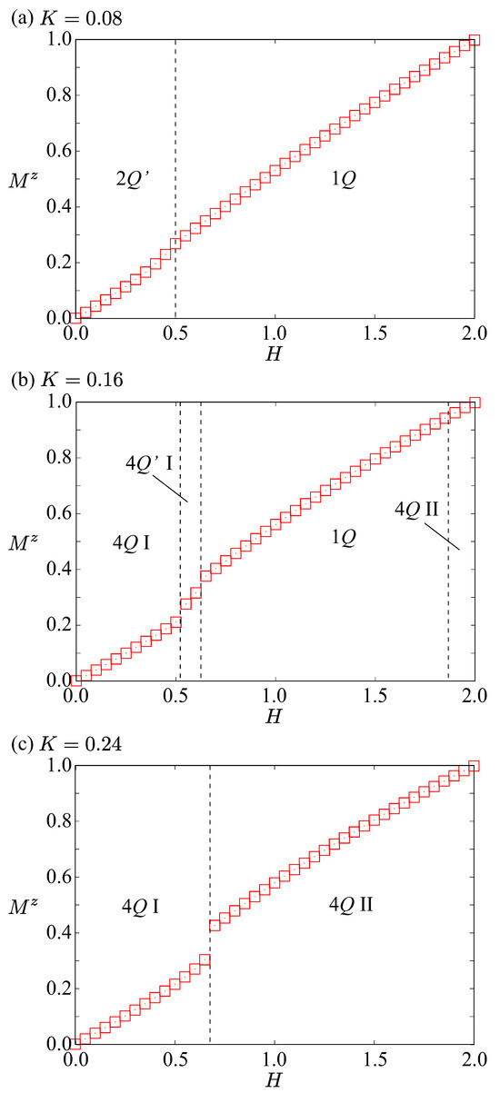 As the biquadratic interaction K is increased, a new magnetic phase, termed the 4 I state, emerges in the intermediate-field region, as shown in Figure 1. The spin configuration of this phase is depicted in Figure 2c, where the bubble structure characterized by appears in each plane. Since there is no vorticity around the bubble structure in terms of the -spin component, this differs from the skyrmion; there is no emergence of uniform scalar spin chirality in this phase. The transition between the 2 and 4 I states is found to be a first-order phase transition, as evidenced by the abrupt change in the spin structure factor. On the other hand, the transition between the 1Q state and the 4 I state is smoother, corresponding to a second-order phase transition, as indicated by the continuous change in the magnetization curve shown in Figure 3a.