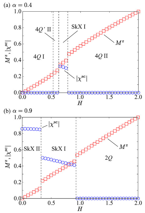 With the increase in H in the 4 II state, SkX I appears in the phase diagram in Figure 6. The spin configuration is characterized by the equal intensity of the spin structure factor at –. The real-space spin configuration is given in Figure 7b, where the skyrmion core at is found around . Owing to the positive winding number around the skyrmion core, the scalar spin chirality around the skyrmion core becomes negative, as shown in Figure 8b, which results in the skyrmion number of . It is noted that the antiskyrmion crystal with a skyrmion number of has the same energy as the SkX with a skyrmion number of , since there is no magnetic anisotropy in the present model [95]. The region of the SkX I phase extends as increases, which indicates that the high-harmonic wave–vector interaction plays a significant role in stabilizing the SkX spin texture. The phase transitions between the SkX I and other magnetic phases are characterized by the first-order transitions owing to the different skyrmion numbers. The magnetization process shows a jump structure below and above the SkX I phase, as shown in Figure 9a.