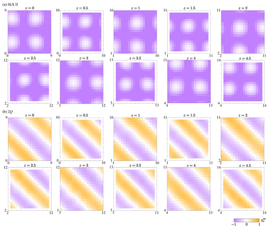 We find another SkX phase (SkX II phase) when the high-harmonic wave–vector interaction is almost comparable to the dominant interaction, i.e., . This spin configuration in real space is shown in Figure 10a, which includes two vortices with the positive winding number () around the region with the negative z-spin polarization and two antivortices with the negative winding number () around the region with the positive z-spin polarization in each plane. In other words, the SkX II phase consists of two vortices with the skyrmion number and two antivortices with the skyrmion number , which results in the skyrmion number of two in the magnetic unit cell. Such a feature is found in the real-space scalar spin chirality in Figure 11b. According to the high skyrmion number, the scalar spin chirality in the SkX II is larger than that in the SkX I, as shown in Figure 9b. This square SkX II phase has also been found in different spin models with bond-dependent magnetic anisotropy [96,97]. The SkX II turns into the SkX I by applying the magnetic field with a jump of the skyrmion number (scalar spin chirality) as well as the magnetization, as shown in Figure 9b.
