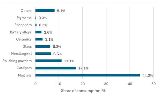 - Distribution of Rare Earth Element Consumption Worldwide in 2022, by End Use. Available online: https://www.statista.com/statistics/604190/distribution-of-rare-earth-element-consumption-worldwide-by-end-use/ (accessed on 30 November 2024).