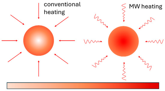 Microwaves are electromagnetic waves (1–1000 mm) that convert wave energy into heat upon interacting with materials. Microwave processing, influenced by a material’s dielectric and magnetic properties, has been used for synthesis, drying, sintering, and advanced material processing over the past 65 years. Mishra et al. classify it into three categories: low-temperature (<500 °C) for food and polymers, moderate-temperature (500–1000 °C) for ceramics and powders, and high-temperature (>1000 °C) for dense ceramics and composites [43]. Unlike conventional heating, which transfers heat externally, microwave heating generates rapid and uniform heat throughout a material’s volume (Figure 2) [43,44].