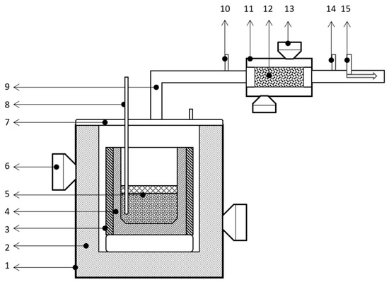 MW laboratory furnace. 1. Furnace shell (steel); 2. insulating material (alumina); 3. MW susceptor material (SiC); 4. melting crucible (graphite, SiC, BN); 5. batch; 6. MW furnace magnetrons/generators; 7. furnace lid (steel); 8. thermocouple (K or S type); 9. gases/NOx exhaust pipe (flexible, steel); 10,14. gases/NOx capture nozzles; 11. thermal filter for tartar/neutralization of gases; 12. MW susceptor material (SiC balls/foam); 13. MW magnetrons thermal filter; 15. Venturi tube.