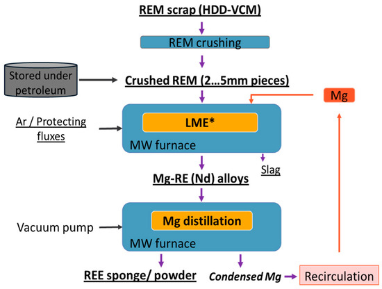 Rare earth elements (REEs) possess unique physical and chemical properties that render them indispensable in various industries, including electronics, energy production and storage, hybrid and electric vehicles, metallurgy, and petro-chemical processing. The criticality of REE underscores the need to enhance the efficiency of primary resource extraction and promote circularity through increased recycling from secondary sources. This paper provides a brief overview of REE recovery from secondary sources, particularly waste from electronic and electric equipment (WEEE). The discussion encompasses direct reuse of magnets, short-loop recycling (direct recycling), hydro- and pyrometallurgical processes, highlighting microwave (MW) technology. Original results are presented, focusing on the recovery of neodymium (Nd) from permanent magnet scraps from hard disk drives (HDD-PC) using microwave-assisted liquid metal extraction (LME) with magnesium (Mg) as the extractant. The subsequent separation of Nd from the Mg-Nd alloy via vacuum Mg distillation that is reused in the process is described. The experimental study demonstrates that the LME process, conducted in a microwave furnace, is a viable method for recovering Nd from permanent magnet scraps, which are essential for reducing the environmental impact of REE extraction and promoting a circular economy. By separating Nd from the alloy through vacuum distillation (450–550 mmHg), at temperatures of 850–900 °C for 8 h, a Nd sponge with a content of 95–98 wt.% Nd was obtained. The extracted content of Nd in the Mg alloy increases with increasing temperature and holding time. It was found that ≈ 97% of the Nd in the scrap was extracted from 2 to 5 mm crushed scrap at 800 °C for 8 h, using a LiF-LiCl-MgF2 protecting flux in a furnace Ar atmosphere.