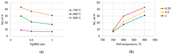 The Mg/REE ratio signifies the content of REEs added to the melt. It is observed that a lower ratio at lower process temperature has negligible effect on the efficiency. Once the temperature is raised over 800 °C, the recovery level varies with several percentage differences on the initial Mg/REE ratio. At 800 °C, when the Mg/REE ratio decreases from 0.5 to 0.25, the Nd percentage in the ingot increases with almost 9 wt.%. The same significant effect is met at 900 °C, when the difference is of about 6 wt.% (Figure 9a). The improved content of Nd at higher temperatures could be justified by the increased element diffusion in the melt. However, the highest Pr content was extracted at a lower Mg/REE ratio and lower temperature. The solubility limit of Pr in Mg is significantly lower so the increase in temperature does not have the same effect as for Nd.