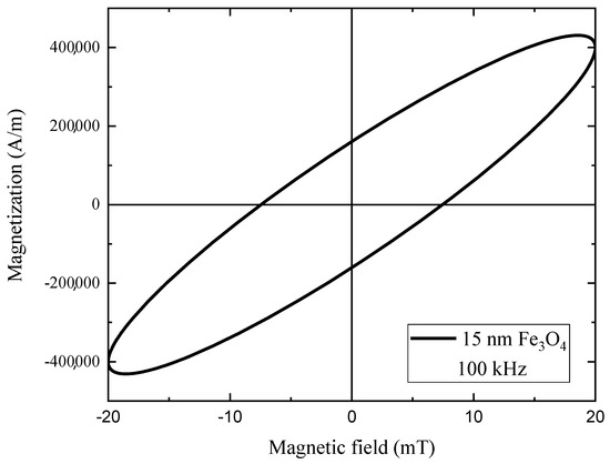 The hysteresis loop, depicted in Figure 3, reflects the reduction in magnetization due to the nanoscale size of the particles compared to the bulk material [46]. Furthermore, the low field of 20 mT cannot cause a completely saturated magnetization of the system of interacting nanoparticles since the characteristic field of the cubic anisotropy is as high as 2K/M_s = 60 mT, which is much higher than the coercive field obtained here (≈8 mT). By integrating the data of Figure 3, we found that hysteresis loop area equals to 3.6 J/kgMNPs. By multiplying this value to the driving frequency value, we found Qext .
