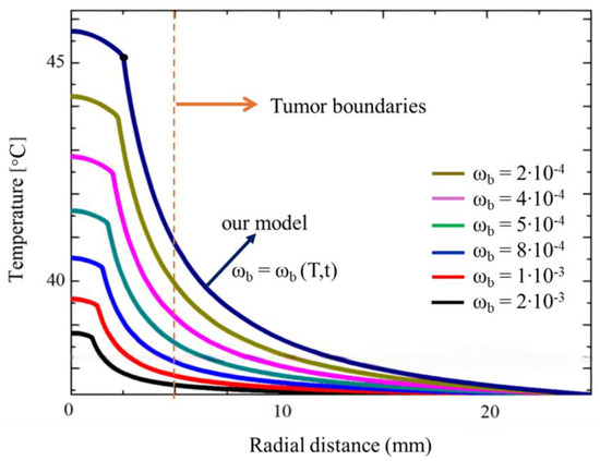 Then, we estimated temperature distribution within the geometry. The heating source of the tumor are the MNPs, with their losses given by Equation (2). Since blood acts as a heat sink because of perfusion, an efficient amount of energy is required to attain an MNH-appropriate temperature increase, which is illustrated in Figure S1 after t = 3600 s of MNH treatment. Temperature as a function of the radial distance is depicted in Figure 5, together with the distributions obtained for different values of blood perfusion found in the literature. Figure 5 highlights the significant role of blood perfusion in determining the achievable temperatures within the tumor and surrounding healthy tissue. The curves indicate that higher perfusion rates lead to enhanced heat dissipation, resulting in lower steady-state temperatures. Conversely, lower perfusion rates contribute to increased tumor heating. Our model incorporating variable perfusion ωb = ωb(T,t) predicts a more realistic temperature distribution, as it accounts for physiological responses to hyperthermia treatment. The results demonstrate that assuming a fixed perfusion rate may underestimate the temperature profile, affecting treatment predictions. This variability emphasizes the need for considering a range of perfusion values, as biological properties are subject to individual differences.