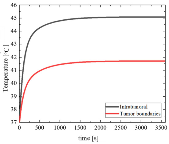 Temperature time evolution at two different tumor positions. The intratumoral distribution corresponds to the site positioned 2.5 mm from the center of the tumor (black point in Figure 5) while the distribution in the boundaries between tumor and healthy tissue is taken at 5 mm.