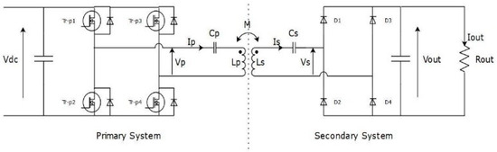 Before optimizing the coupler, other parts of the vehicle battery load converter chain will be described. Firstly, the grid voltage is rectified by an AC–DC converter supplying the systems and allowing the integration of PV energy directly along the road. The voltage applied on the primary of the coupler is obtained with an individual full bridge converter operating at around 85 kHz. The frequency can vary in a range going from 90 kHz to 81.38 kHz and is selected in function of the car position for a best efficiency allowing a permanent transfer of power [7]. Several inverter topologies can be used in DIPT for high efficiency [8] with, for example, a maximum to four outputs with one inverter, reducing by a factor 4 the needs for inverters [9], but this work is not focused on this aspect. Capacities in series are inserted before the coupler because it permits an efficient constant current and a constant voltage load configuration of a battery. A 15 cm air gap is then considered in the coupler, before a compensation network, a rectifier bridge and battery on the secondary, as shown in Figure 1. The electromagnetic field generated in the coupler by the alternating voltage through the coil Lp will induce an AC voltage in Ls, as represented in Figure 2. After the rectifier stage, this voltage will imply a DC current charging the vehicle battery, modeled presently as a resistance as depicted in [10].
