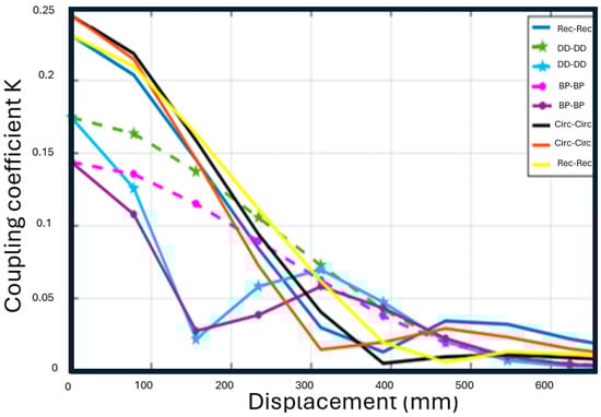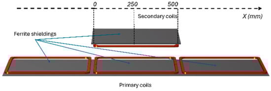The magnetic coupler is the main one responsible for the system efficiency of the WPT design. Although different topologies of coils (circular, rectangular, double D, bipolar…) exist, we select for the dynamic transfer the one offering the best coupling coefficient despite the impact of the misalignment (Figure 3). The rectangular shape is, therefore, chosen to enhance the continuity of magnetic coupling in the dynamic aspect [12]. In addition, ferrite plates were added over the conductor to improve the magnetic field canalization, thus, enhancing the coupling coefficient between a primary and a secondary (Figure 4).