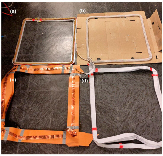 Prototypes of the four coupler architectures: (a) copper Litz wires, (b) aluminum Litz wires, (c) copper ribbon, and (d) aluminum ribbon.