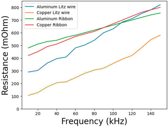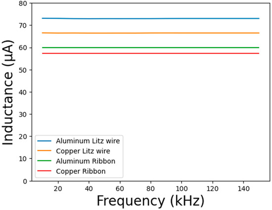 Using an impedance analyzer, the 4192A, the resistance and inductance of each conductor are measured in function of the frequency from 10 kHz to 100 kHz, as observed in Figure 6 and Figure 7, respectively, with determination of the resistance at 80 kHz in case of the Litz copper wire.