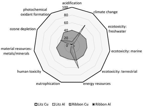 Results of Figure 8 underline the influence of the material selected on the overall environmental profile. Indeed, fewer minerals are consumed to produce aluminum architectures than copper ones. As aforementioned, Litz wires require 683.62 g of copper and 187.62 g of aluminum, while ribbons require 281.25 g of copper and 130.12 g of aluminum, respectively (Table 1 and Table 2). This implied lower environmental impacts, as stressed by the resource depletion impact category, i.e., material resources: metal/minerals.