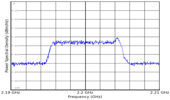 A third National Instruments USRP (Europe), with identical RF and digital specifications, was used to generate RF interference signals at various centre frequencies. A Rohde & Schwarz spectrum analyser monitored the power spectral density (PSD) of the received signal in the presence of interference. Frequency scanning between 2.194 and 2.2045 GHz identified the most EMI-sensitive centre frequencies, with interference gains set at 12 dB, 15 dB, and 18 dB.