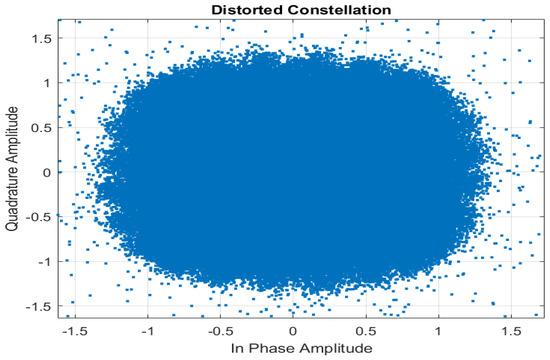 The EVM is defined as the measure of how far the actual transmitted signal deviates from the ideal or reference signal in a constellation diagram. In simpler terms, it measures the difference between the ideal signal points and the points where the actual received signal ends up due to various imperfections in the transmission process [8]. The equation for calculating the EVM is given by