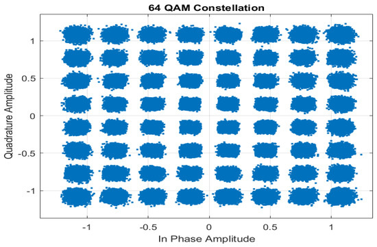 Figure 5 illustrates a peak centred at 2.2045 GHz, resulting from the injection of transient EMI. This EMI not only contributes to the SINR reduction but also leads to substantial distortion in the signal constellation. As shown in Figure 6, the constellation exhibits the effect of noise that can vary between symbols. This noise around the ideal symbol configuration suggests that the received symbols are displaced from their intended positions, reflecting the detrimental effects of frequency distortion on the integrity of the signal and the overall performance of the LTE communication system. This can be verified by comparing Figure 7, which a perfectly received 64 QAM constellation, with Figure 6, showing distortion. Additionally, the received constellation appears to be a single noise cloud around the origin if the magnitude of the interference increases to a level where the decodability of the data symbols is not possible. These findings underscore the critical impact of transient EMI on the reliability of LTE communications.
