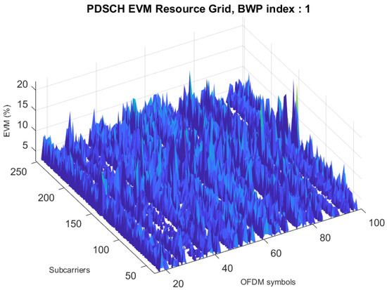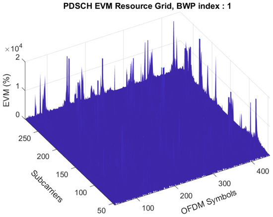 A distinct peak can be observed in Figure 8, resulting from the jammer effect. This peak indicates a significant increase in energy, which consequently distorts the EVM resource grid shown in Figure 9. This effect becomes evident when the jammer’s transmit gain is set to 18 dB. The presence of the jammer induces substantial interference in the communication link, leading to a higher EVM peak. A comparison can be made by referring to Figure 10, where a considerable number of OFDM symbols and subcarriers exhibit a low EVM%.