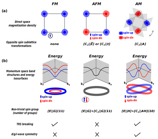 or, where is the real space inversion and t denotes translation. gives the nontrivial spin group that characterizes the AMs. H is the Halving subgroup possessing half elements of the real space transformation of the nonmagnetic Laue group G, which includes the identity element of real space. The contains the residual half of the transformation, where A is a real-space rotation (proper or improper, symmorphic or non-symmorphic), but excludes the identity and inversion operations. Only real space transformations that exchange atoms between sublattices of the same spin are contained in H, and exclusive real space transformations that exchange atoms between sublattices of opposite spin are present in . The non-trivial spin subgroup determines the anisotropic spin densities in real space. In contrast, [||AH]E(k,)=E(k’,−); this implies that E(k,) ≠ E(k’,−), indicating that is responsible for broken TRS and non-relativistic spin splitting of bands. Together, there are ten nontrivial spin Laue groups categorizing d-, g-, and i-wave AMs [4,5].