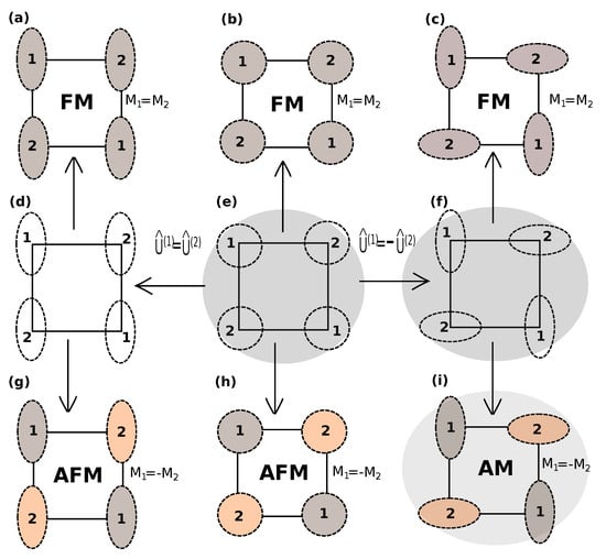 (a–c) represent the ferromagnetic phases (FM with = ), while (g–i) represent the staggered magnetic phases (AFM or AM with = ), and (d,f) are structural phases. Any magnetic phase can be derived from the highly symmetric hypothetical phase demarcated in (e) with no magnetic order and an isotropic local environment of magnetic atoms (shown with circles). The distortion of the local environment leads to two different structural phases with equal ( = ) or a distorted ( = ) local environment (U’s are second rank symmetric tensors illustrating the feasible distortion of the sublattices). Combining the staggered environment with the staggered order gives altermagnetism. The sign of the exchange coupling between atoms 1 and 2 determines whether the magnetic order results in staggered () or ferromagnetic ( = ) structures. This figure is reproduced from Ref. [13] under CC-BY 4.0 International License. Published by Springer Nature, copyright 2024.