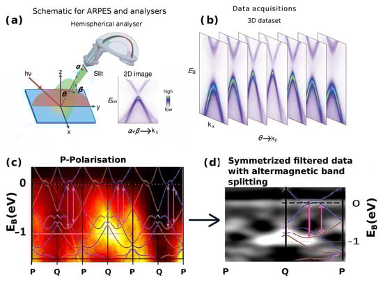 Various experimental methods have been employed to confirm NRSS in AMs, with angle-resolved photoemission spectroscopy (ARPES) being a key technique. ARPES operates on the principle of the photoelectric effect [89,90], where a spectrometer records the intensity I of emitted photoelectrons based on their kinetic energy and emission angle . A schematic of the experimental ARPES basic setup is shown in Figure 4. This technique directly maps a material’s energy-momentum (E-k) relationship [91].