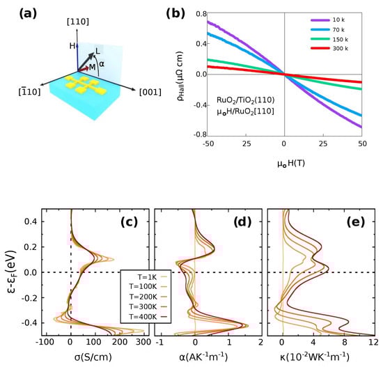 Magneto transport measurements. (a) Orientation of the sample along the [110] direction. The red, brown, and black arrows represent the magnetization, Néel vector, and applied field, respectively. (b) Experimental measurement of Hall resistivity with the sample oriented along the [110] direction, respectively. (a,b) are reproduced with permission [198]. Copyright 2022, Springer Nature. (c–e) First-principles simulations of anomalous Hall conductivity , anomalous Nernst conductivity , and anomalous thermal Hall conductivity in a [110]-oriented film at different temperatures. (c–e) are reproduced with permission [208]. Copyright 2024 APS.