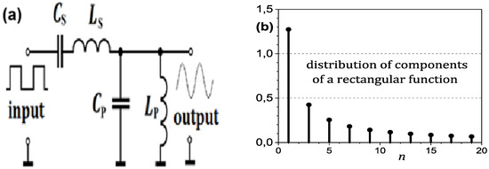 It consists of electric coils and capacitors with a high quality factor, with the serial branch consisting of a CS capacitor and an LS coil, while the other branch contains parallel-connected CP and LP elements. If we select these elements so that they meet the condition CSLS = CPLP, it turns out that at the resonant frequency f0, the series branch of CSLS will show zero reactance, while the parallel branch of CPLP will have a very high reactance at this frequency. Such diversification of the reactance of both branches will occur only for the selected frequency. All other harmonics will be largely eliminated and will practically not occur at the output of the filter. A rectangular signal contains many higher harmonic components whose amplitude is determined from the Fourier distribution [18]: