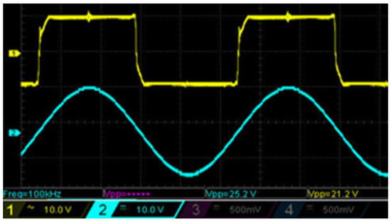 Real waveforms of signals at the input and output of the band-pass filter at a frequency of f = 100 kHz. Time scale along the x-axis: 2 μs/div. Signal scale along the y-axis: 10 V/div. Signal amplitudes: yellow, 21.2 Vpp; aquamarine, 25.5 Vpp.