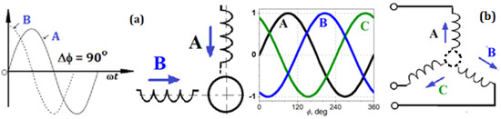 The principle of creating a rotating magnetic field in a two-phase system (a) and in a three-phase system (b).