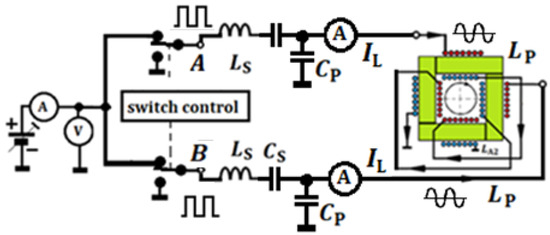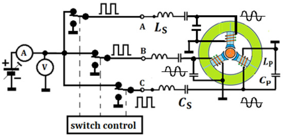 The diagram of a three-phase RMF-generating device [17] shown in Figure 7 works according to a similar principle as previously presented. In both two- and three-phase systems, the bandpass filter parameters should meet the following criteria: LSCS ≅ LPCP.
