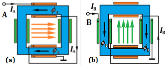 RMF generation in a two-phase system with two pairs of Gramme coils. Currents and magnetic fluxes are shown for successive phases of sinusoidal waveforms (90°). In (a), the maximum current IA flows through circuit A while the current IB =0. In turn, in (b), after time T/4, IA = 0, while the current IB reaches its maximum flowing through circuit B.