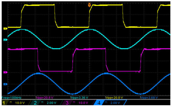 Example waveforms of real rectangular and sinusoidal signals from the outputs of the switching system and on the LP magnetizing coils (from 1:7 coils) of the magnetic system. Time scale along the x-axis: 2 μs/div. Signal scales along the y-axis: yellow and purple, 10 V/div; aquamarine and blue, 2 V/div. Signal amplitudes: yellow, 20 Vpp; aquamarine, 3.36 Vpp; purple, 20.8 Vpp; blue, 3.68 Vpp.
