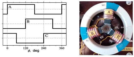 Due to the use of a three-phase system, the arrangement of the three coils of the magnetizing circuits was set every 120 angular degrees, as shown in Figure 8.