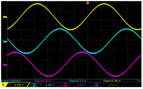 Example waveforms of sinusoidal signals on the magnetizing coils from 1:5 coils LP. Time scale along the x-axis: 2 μs/div. Signal scales along the y-axis: yellow, aquamarine, and purple, 2 V/div. Signal amplitudes: yellow, 5.36 Vpp; aquamarine, 3.36, 5.12 Vpp; and purple, 4.96 Vpp.