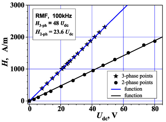 The relationships H(Udc) shown in Figure 11 show a high linearity, and the three-phase system allows us to obtain more than twice (2.22) the value of the amplitude H compared to the two-phase system at the same voltage Udc.