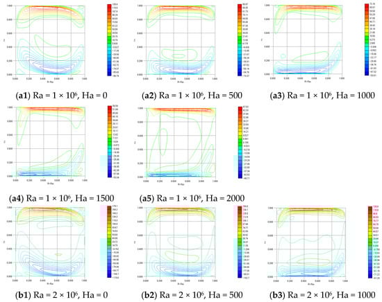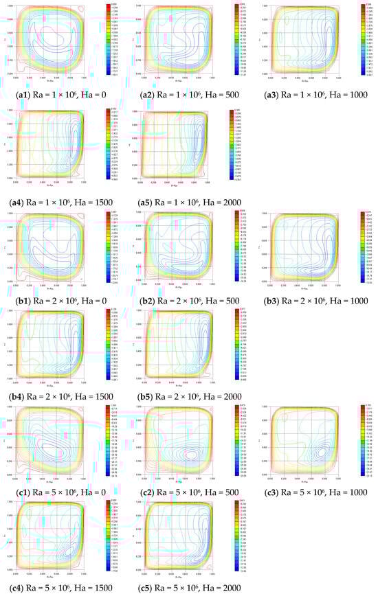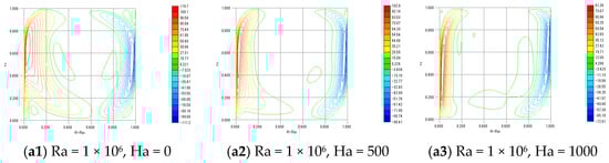 The nondimensional parameters are the Prandtl number , Rayleigh number , and Hartmann number , which are defined by the following Equations (11). In this study, the Prandtl number is fixed at .