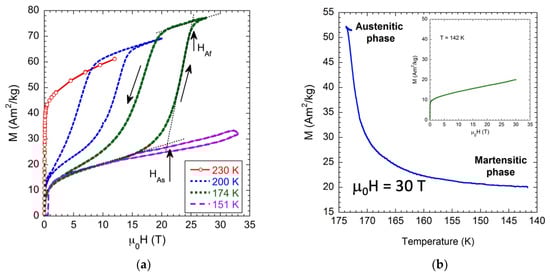 To further analyze this observed behavior, we measured isothermal magnetization curves M(H) under ZFC conditions above and below the corresponding MT temperatures for both alloys. Figure 3a shows such measurements for the x = 4 Fe content alloy (TM = 223 K). The curve recorded at 230 K is clearly in the ferromagnetic austenite phase. Curves measured at 200 and 174 K, temperatures where only the martensite structure is expected to appear within this alloy, show an increase in the magnetization value when the magnetic field is applied, indicating MFIMT, which starts at the austenitic start magnetic field (HAS) with a reversible metamagnetic effect. The measured behavior goes from the low magnetization value of the weak-magnetic martensite to the high magnetization one of the ferromagnetic austenite. The measurement performed at 151 K shows the remaining martensite magnetization, as expected, and is much lower than the austenite one. At this temperature, a full MFIMT is not observed for magnetic fields up to 33 T, displaying only a small increment in the magnetization trend related to a partial MT. Figure 3b shows graphically measured magnetization values determined in FC conditions where the MT takes place completely under 30 T of the applied magnetic field, i.e., there is no arrested austenite, and the kinetic arrest effect does not occur. The inset clearly indicates that at a low temperature (142 K in Figure 3b), the alloy presents a weakly magnetic martensite, which is not affected by the cooling conditions, showing the same behavior for ZFC and FC protocols.