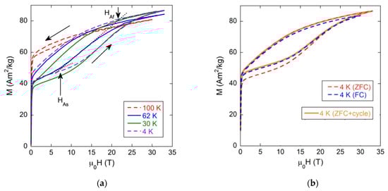 Figure 5a shows similar measurements performed for the x = 5 Fe content alloy (TM = 80 K). The curve recorded at 100 K is in the austenite phase and shows mostly a ferromagnetic behavior. The loops measured at 62 K (practically at the end of the MT) and 30 K (at the martensite phase) are quite similar in shape, and clearly, the martensitic phase contribution to magnetization at low magnetic field and a partial reversible MFIMT, which starts at HAS = 7 T and 11 T, is observed. Finally, the curve measured at 4 K presents a similar behavior, but its width increases, indicating that the reversibility of the MFIMT is restricted and that the fraction of the non-transformed martensite increases due to the magnetic field austenite phase arrest. Moreover, the austenitic phase obtained across the MFIMT is stable over a larger field range as the temperature decreases. Also, the measured magnetization value at the highest applied field of 33 T, at those previous temperatures, slightly increases, indicating that a higher percentage of austenite phase is induced, although it can also be explained by increased saturation magnetization at low temperatures. Figure 5b shows the measured M(H) behavior at 4 K when this temperature is reached in ZFC and FC conditions. While the shape of the two loops is quite similar, it turns out to be lower than the martensitic saturation magnetization when it is measured after ZFC conditions. This fact clearly indicates that the FC protocol partially retains the MT, with the presence of a ferromagnetic austenite phase that reflects in the increase in the saturation magnetization at low magnetic field. Moreover, at this low temperature, the applied magnetic field is still able to induce some transformation of the martensite. The HAS is higher for the FC protocol due to the lower fraction of martensitic phase that can transform in this case.