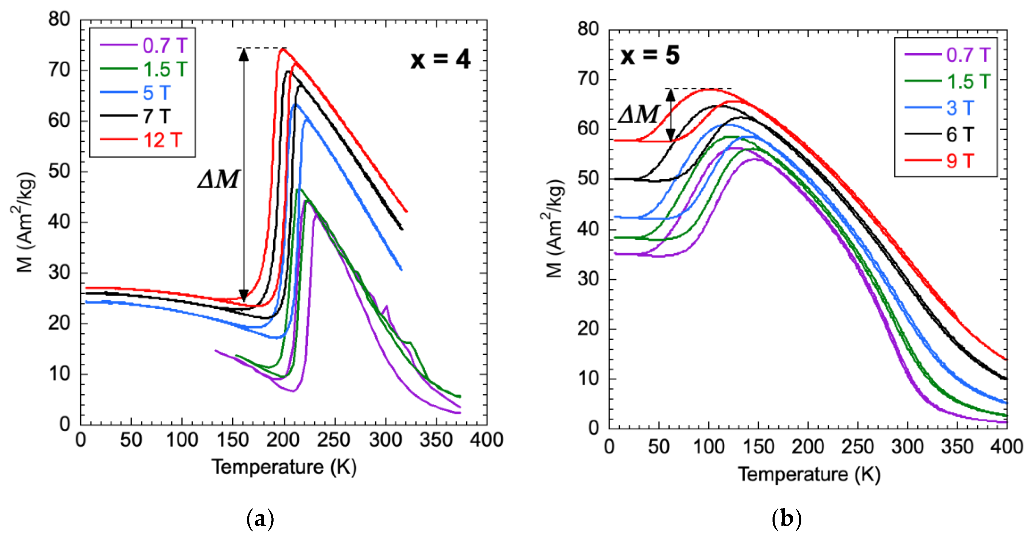 - Krenke, T.; Duman, E.; Acet, M.; Wassermann, E.F.; Moya, X.; Mañosa, L.; Planes, A. Inverse magnetocaloric effect in ferromagnetic Ni-Mn-Sn alloys. Nat. Mater. 2005, 4, 450–454. [Google Scholar] [CrossRef] [PubMed]