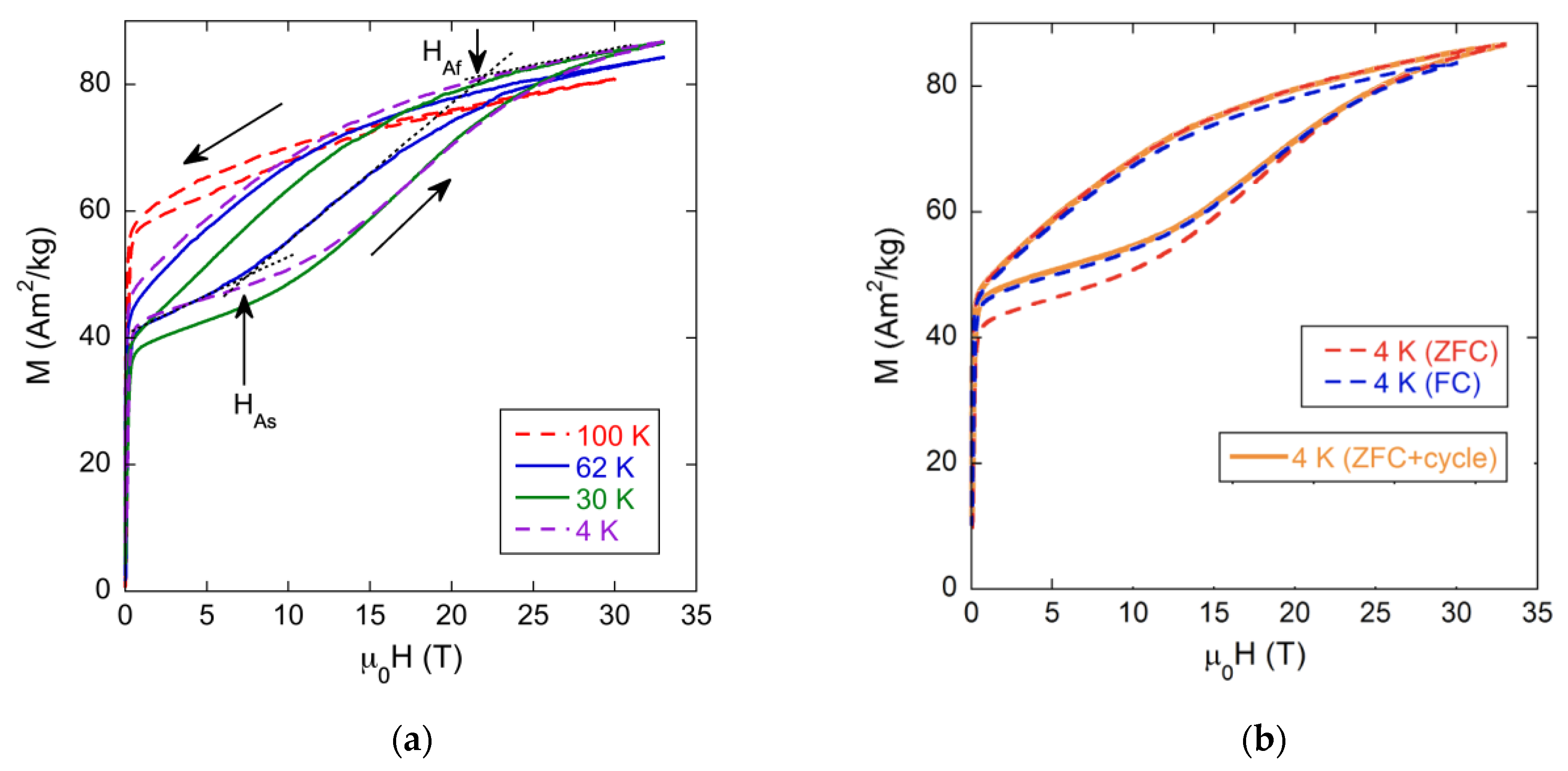 - Umetsu, R.Y.; Xu, X.; Ito, W.; Kihara, T.; Takahashi, K.; Tokunaga, M.; Kainuma, R. Magnetic field-induced reverse martensitic transformation and thermal transformation arrest phenomenon of Ni41Co9Mn39Sb11 alloy. Metals 2014, 4, 609–622. [Google Scholar] [CrossRef]