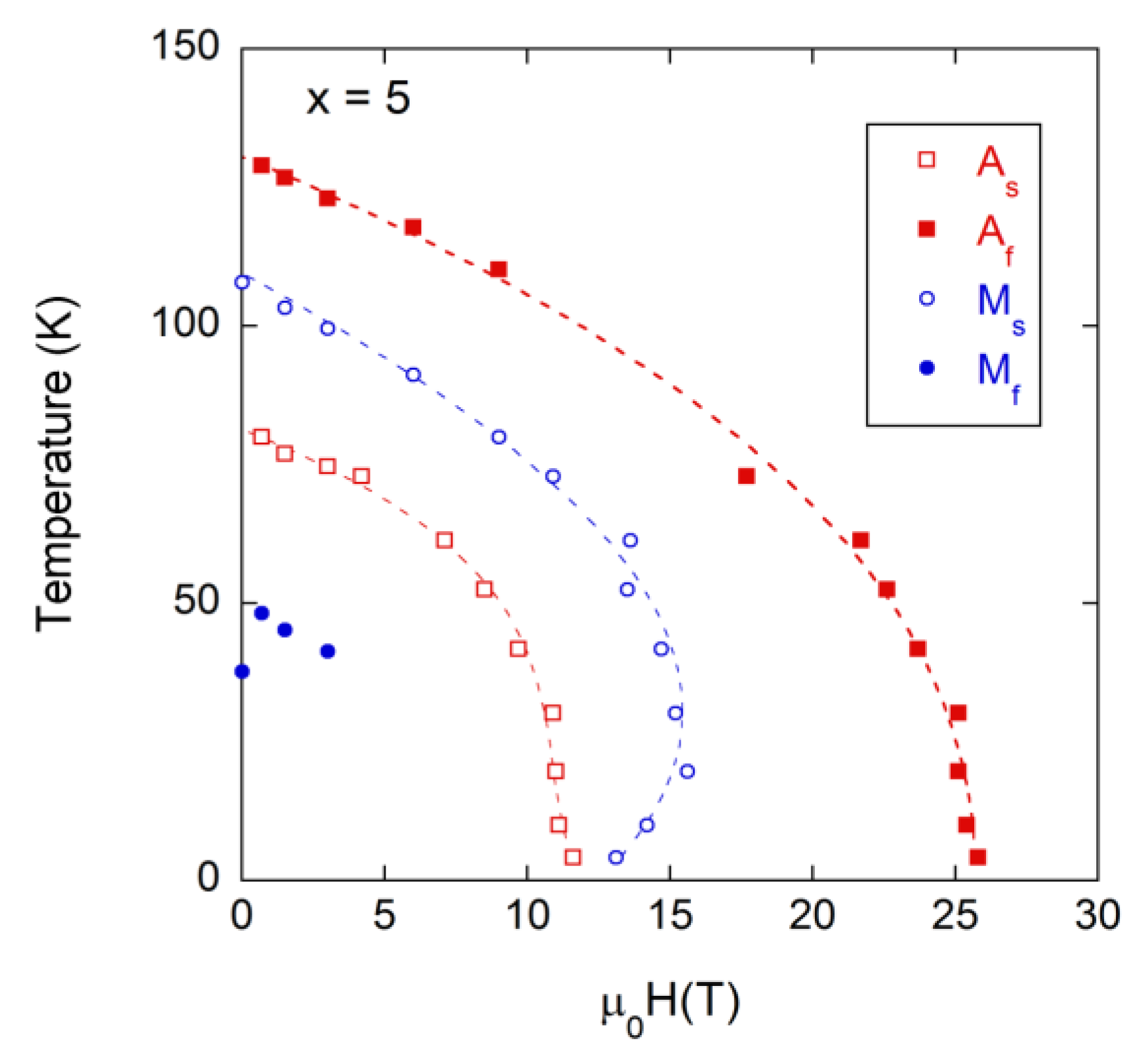 - Lázpita, P.; Pérez-Checa, A.; Barandiarán, J.M.; Ammerlan, A.; Zeitler, U.; Chernenko, V.A. Suppression of martensitic transformation in Ni-Mn-In metamagnetic shape memory alloy under very strong magnetic field. J. Alloys Compd. 2021, 874, 159814. [Google Scholar] [CrossRef]